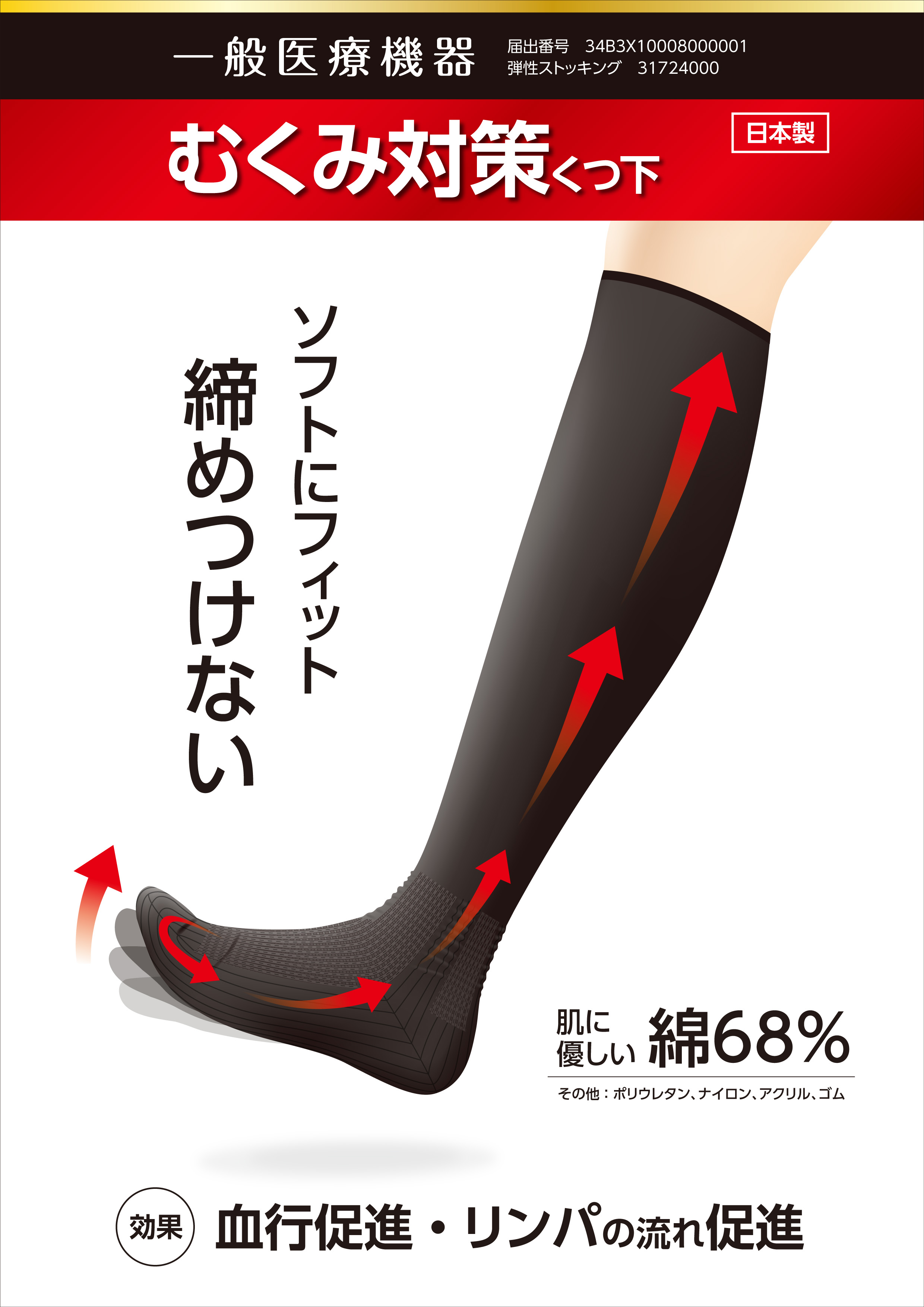 医療機器製造販売業のコーポレーションパールスターが一般医療機器として、2014年6月より発売のむくみ対策靴下(リンパ快促)は「むくみの予防・改善」、「リンパの流れを促進する」効果があり、妊婦さんから高齢者にお薦めです。その仕組みは着圧するのではなく、ふくらはぎを締め付けないフィット感でむくみ対策をします。素材は肌に優しい綿を使い、肌かぶれ対策もしています。